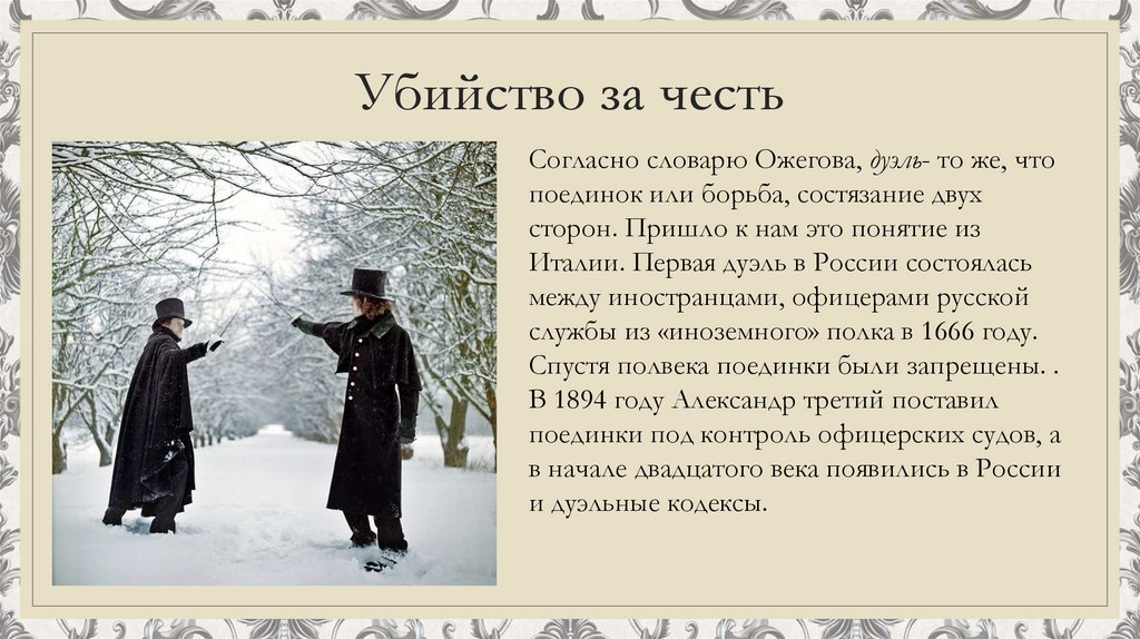 Убийство за честьСогласно словарю Ожегова, дуэль- то же, что