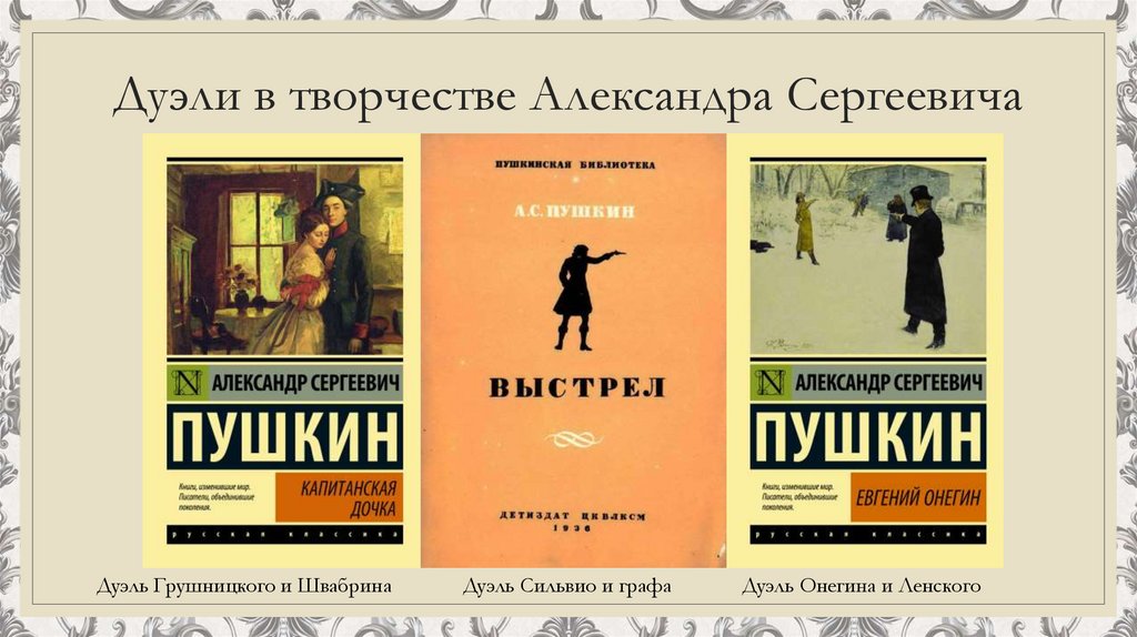 3)Дуэль упоминается в романах «Капитанская дочка» и «Евгений Онегин», а также в повести «Выстрел».