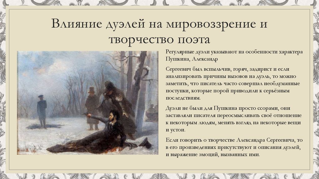 5)Дуэли отражали особенности характера Пушкина, повлияли на его мировоззрение, отношение к