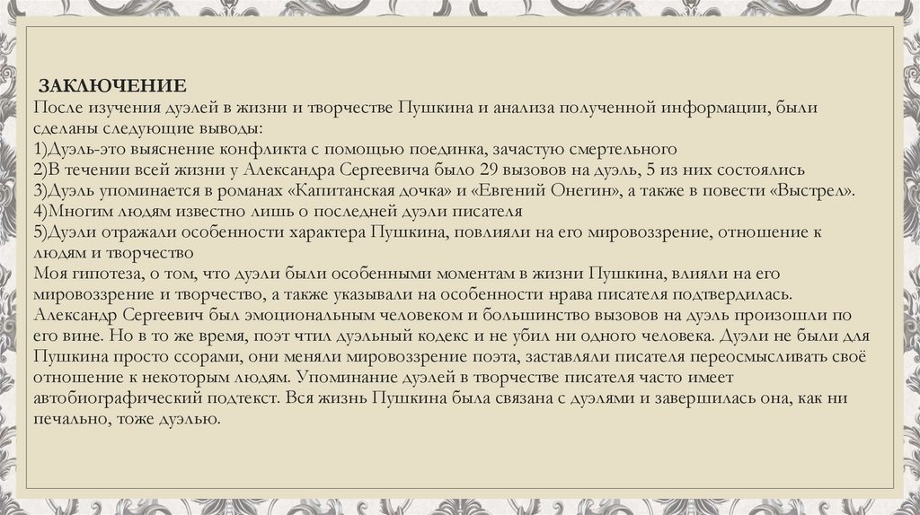ЗАКЛЮЧЕНИЕПосле изучения дуэлей в жизни и творчестве Пушкина и анализа полученной информации, были