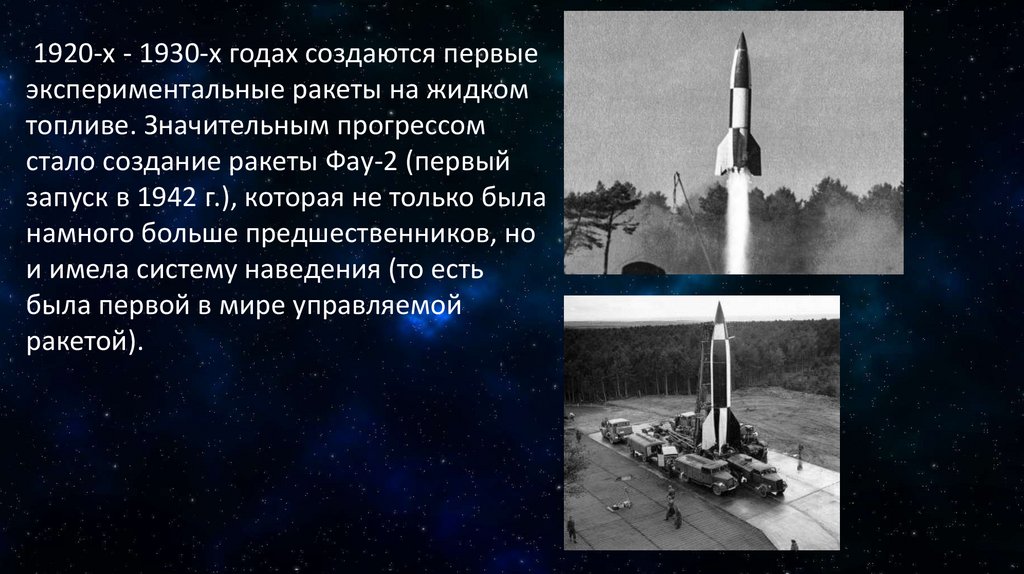 1920-х - 1930-х годах создаются первыеэкспериментальные ракеты на жидком