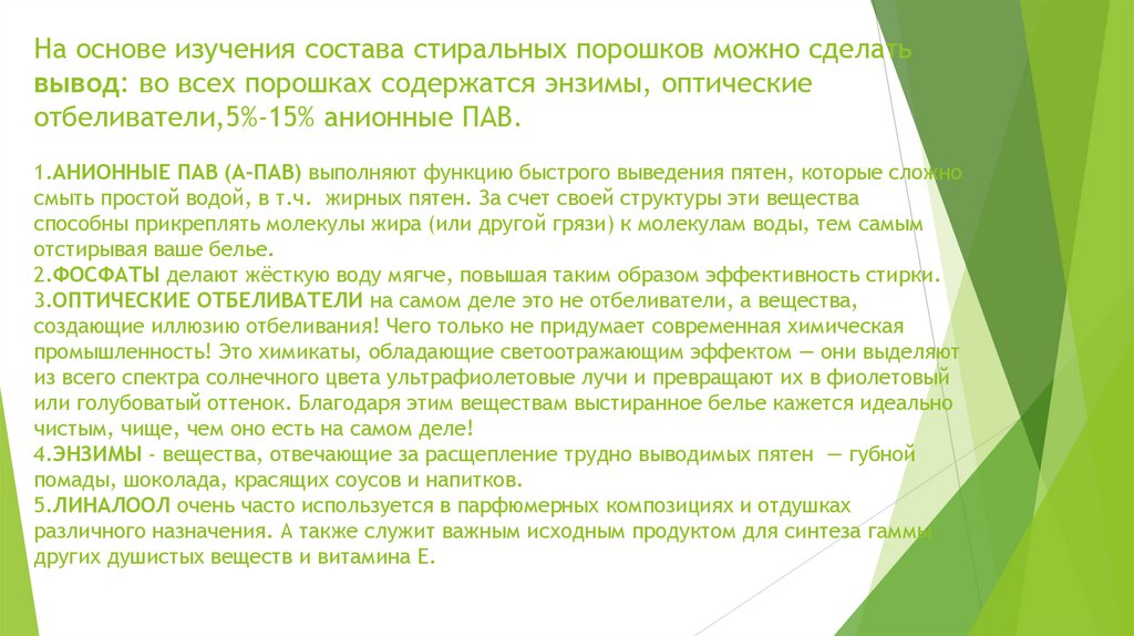 На основе изучения состава стиральных порошков можно сделатьвывод: во всех порошках содержатся энзимы, оптические