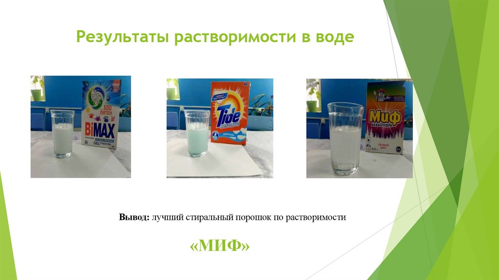 Результаты растворимости в водеВывод: лучший стиральный порошок по растворимости