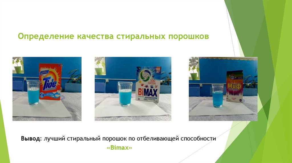 Определение качества стиральных порошковВывод: лучший стиральный порошок по отбеливающей способности