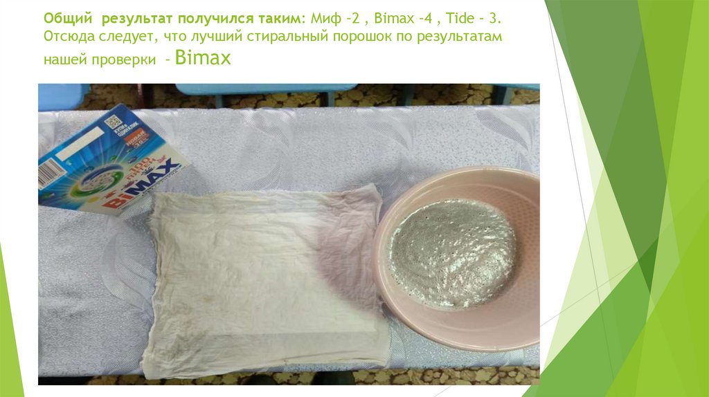 Общий результат получился таким: Миф –2 , Bimax –4 , Tide – 3.Отсюда следует, что лучший стиральный порошок по результатам
