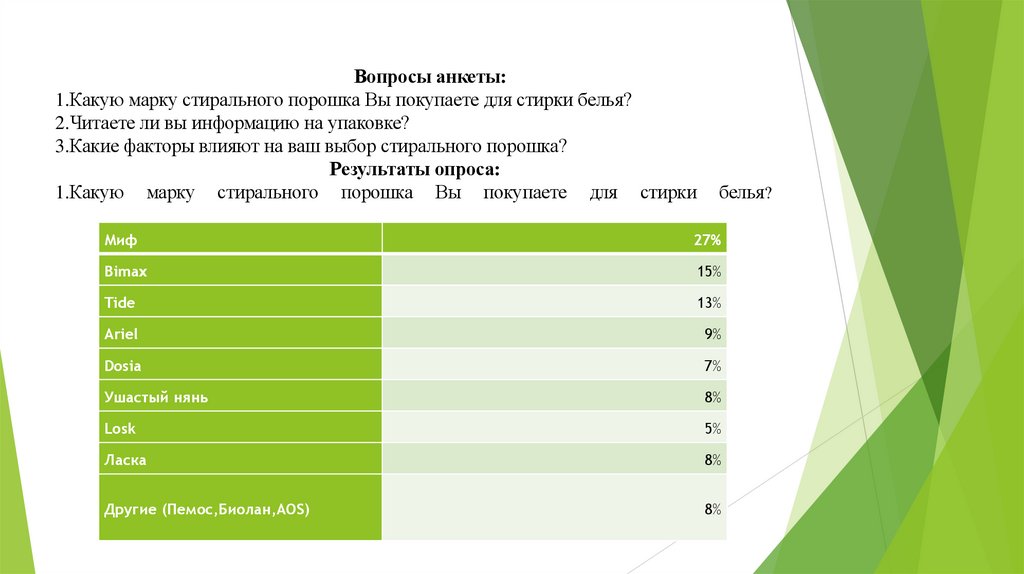 Вопросы анкеты:1.Какую марку стирального порошка Вы покупаете для стирки белья?
