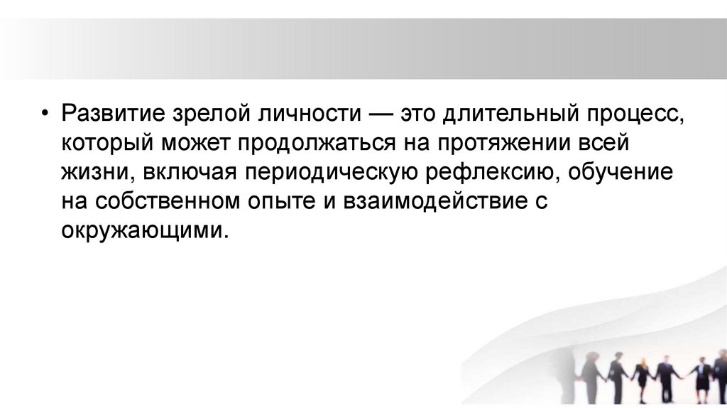 • Развитие зрелой личности — это длительный процесс,который может продолжаться на протяжении всей