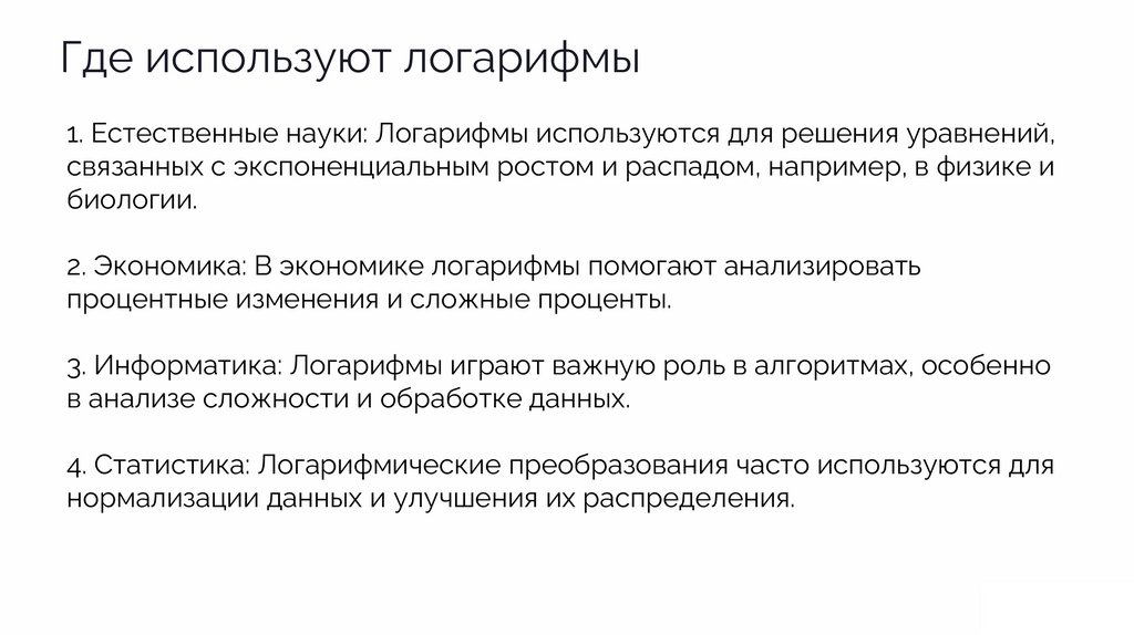 Где используют логарифмы1. Естественные науки: Логарифмы используются для решения уравнений,