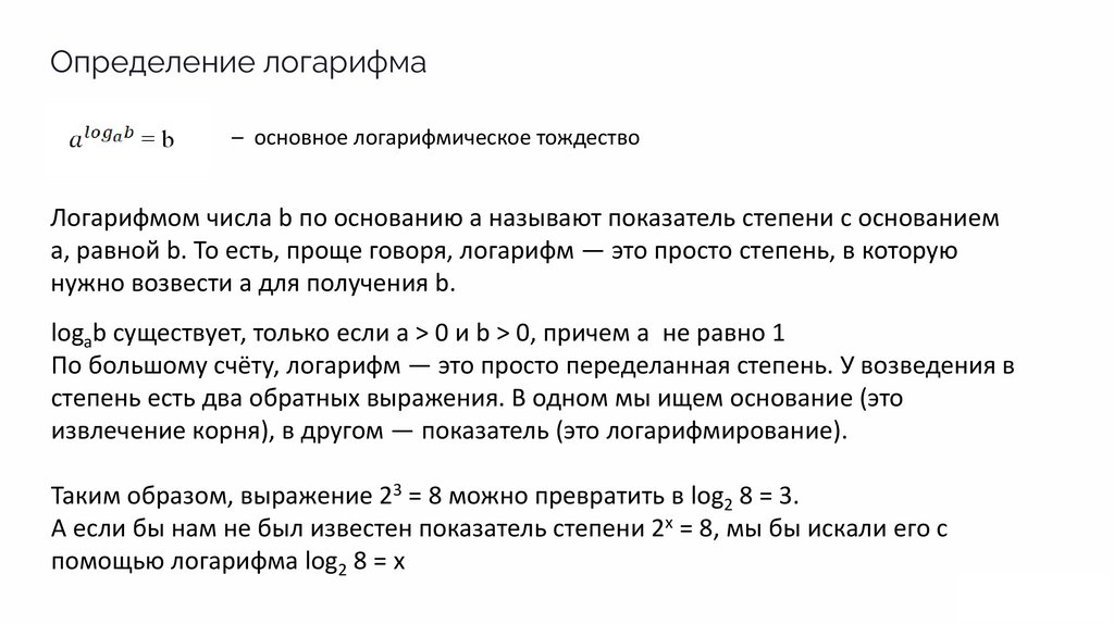 a, равной b. То есть, проще говоря, логарифм — это просто степень, в которую
