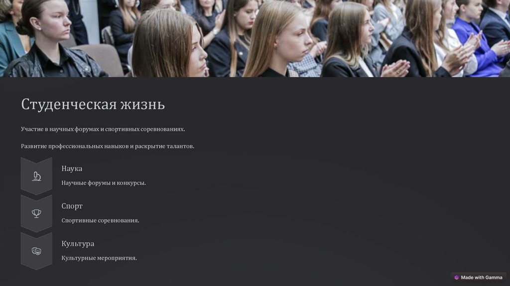 Студенческая жизньУчастие в научных форумах и спортивных соревнованиях.