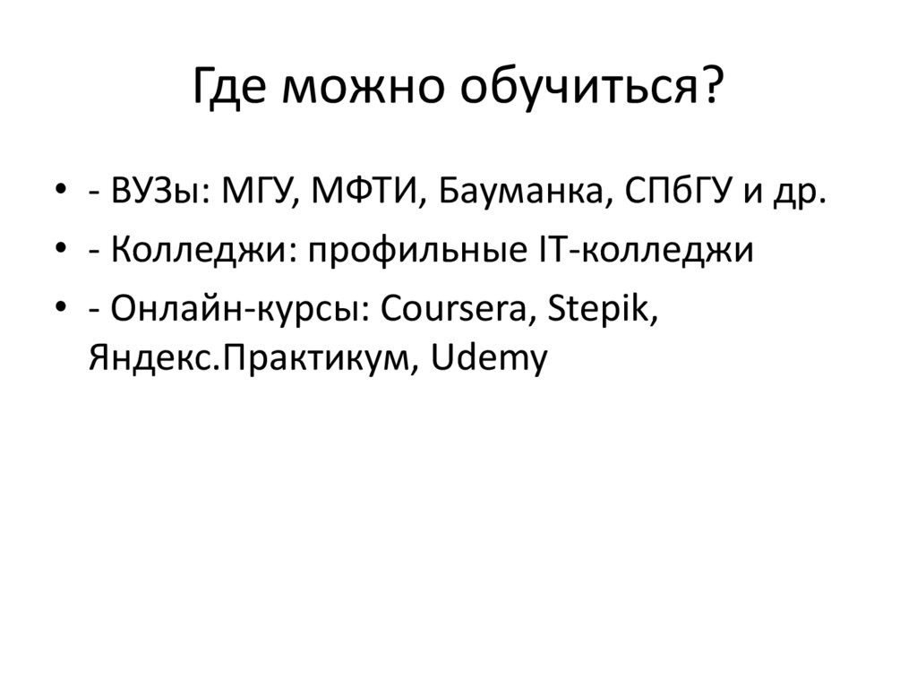 Где можно обучиться?• - ВУЗы: МГУ, МФТИ, Бауманка, СПбГУ и др.