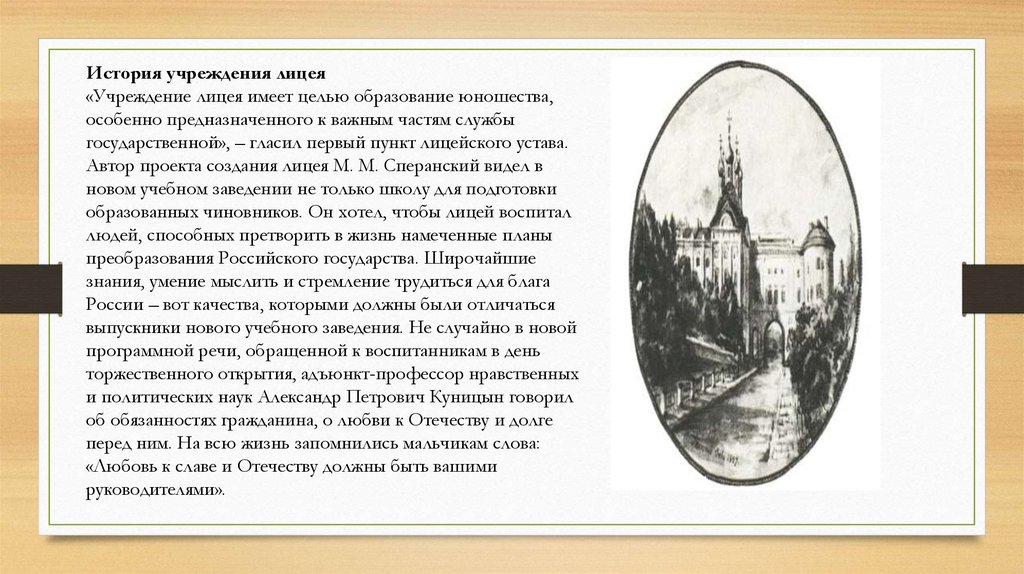 История учреждения лицея«Учреждение лицея имеет целью образование юношества,