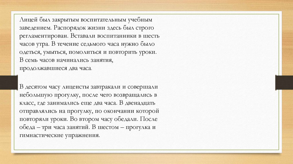 Лицей был закрытым воспитательным учебнымзаведением. Распорядок жизни здесь был строго