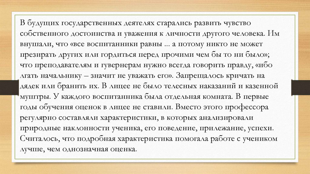 В будущих государственных деятелях старались развить чувствособственного достоинства и уважения к личности другого человека. Им