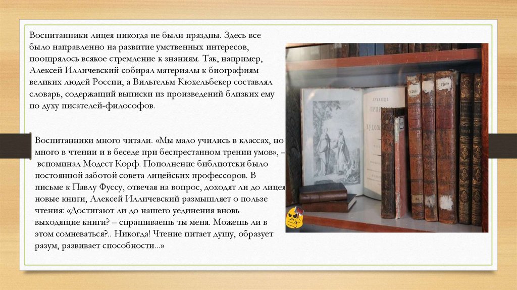 Воспитанники лицея никогда не были праздны. Здесь всебыло направленно на развитие умственных интересов,