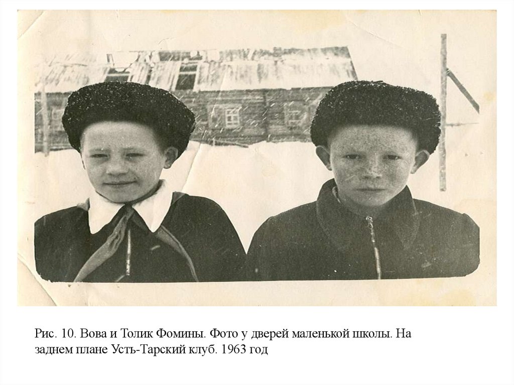 Рис. 10. Вова и Толик Фомины. Фото у дверей маленькой школы. Назаднем плане Усть-Тарский клуб. 1963 год