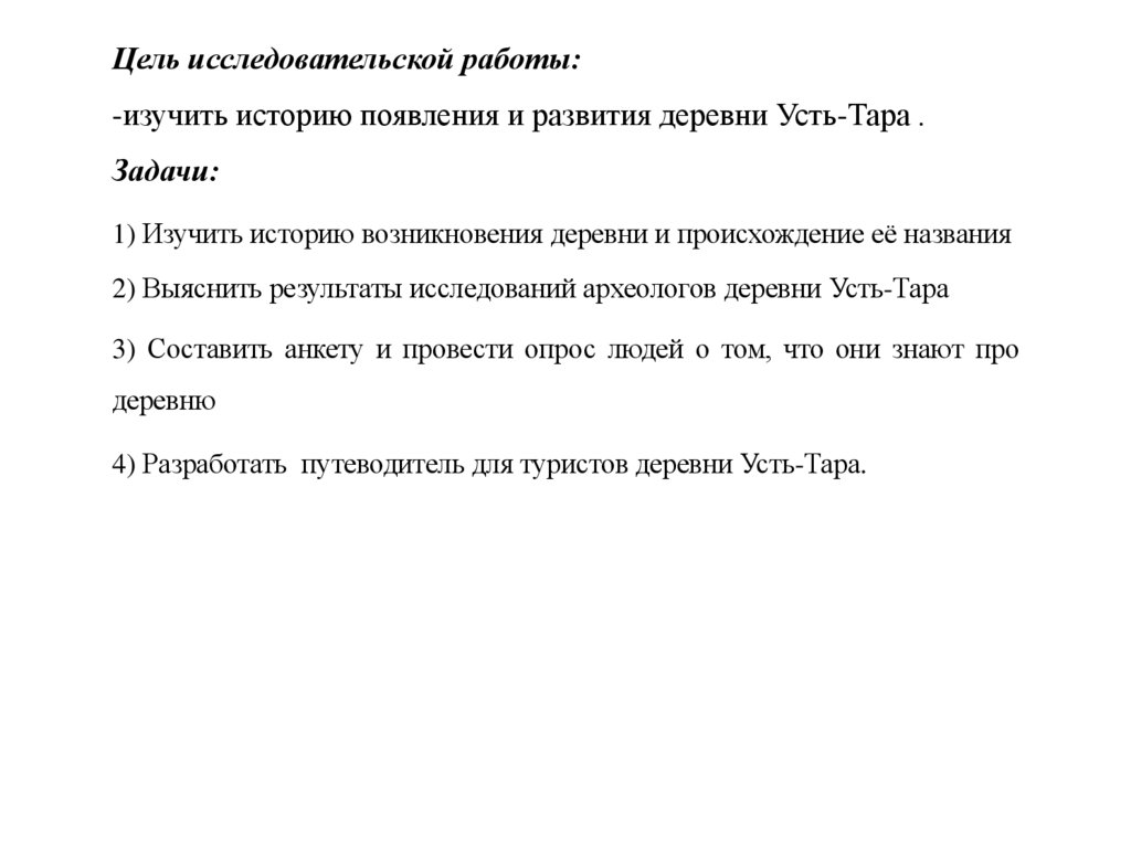 Цель исследовательской работы:-изучить историю появления и развития деревни Усть-Тара .