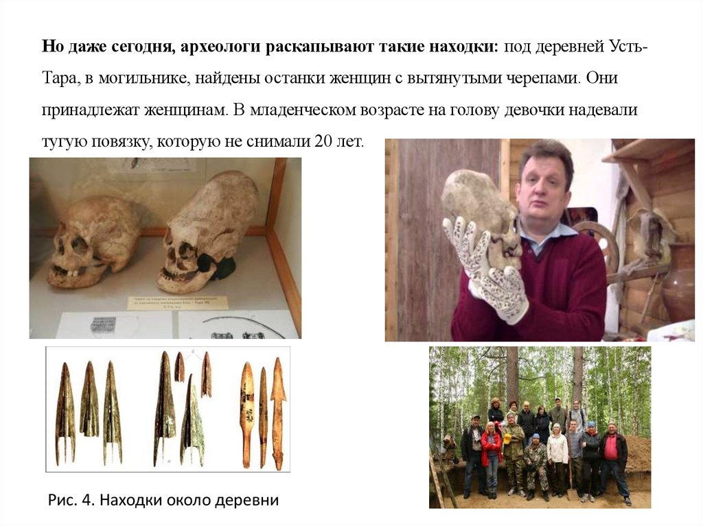 Но даже сегодня, археологи раскапывают такие находки: под деревней УстьТара, в могильнике, найдены останки женщин с вытянутыми черепами. Онипринадлежат женщинам. В младенческом возрасте на голову девочки надевали