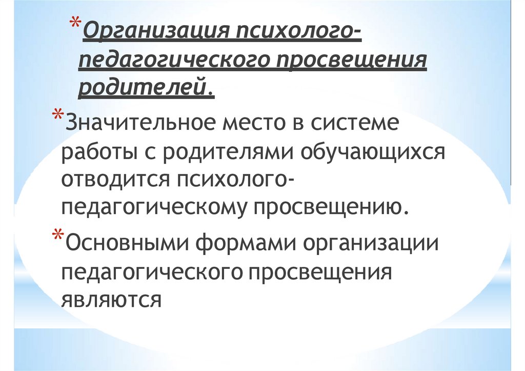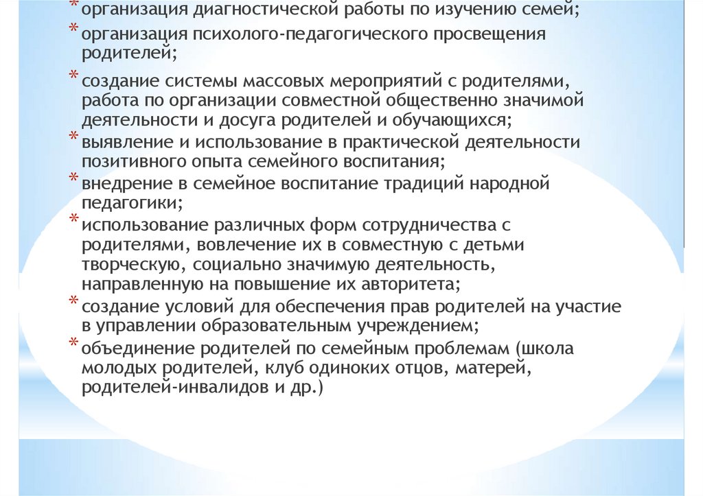 * организация диагностической работы по изучению семей;* организация психолого-педагогического просвещения