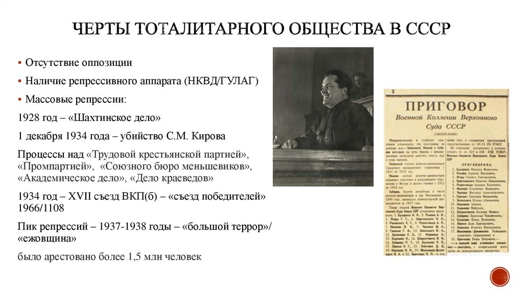 Отсутствие оппозицииНаличие репрессивного аппарата (НКВД/ГУЛАГ)