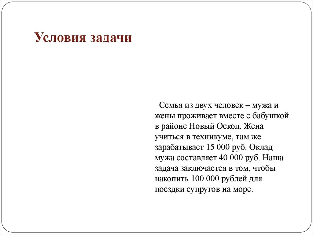 Условия задачиСемья из двух человек – мужа и