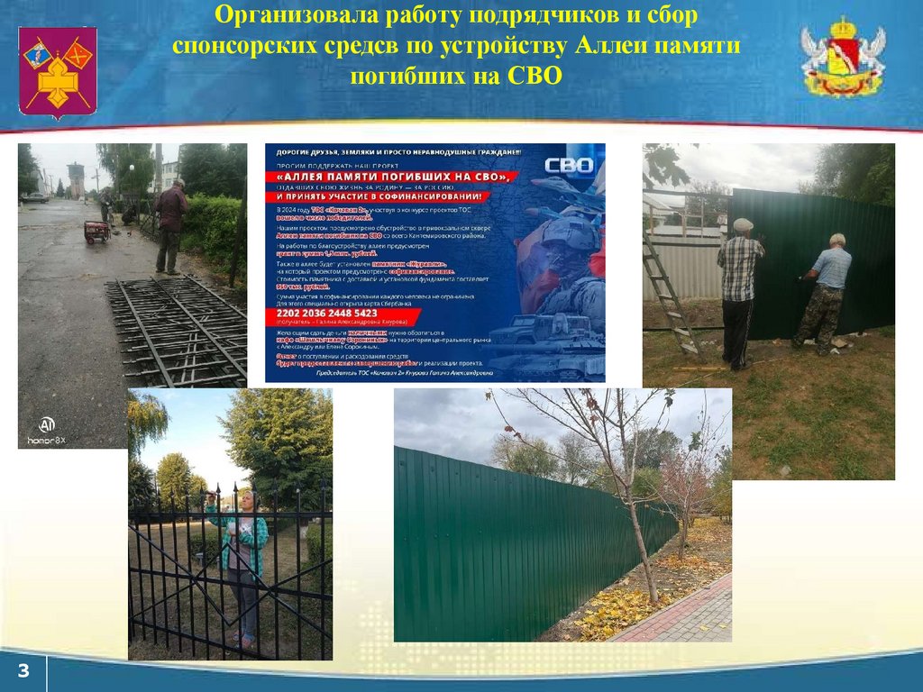 Организовала работу подрядчиков и сборспонсорских средсв по устройству Аллеи памяти