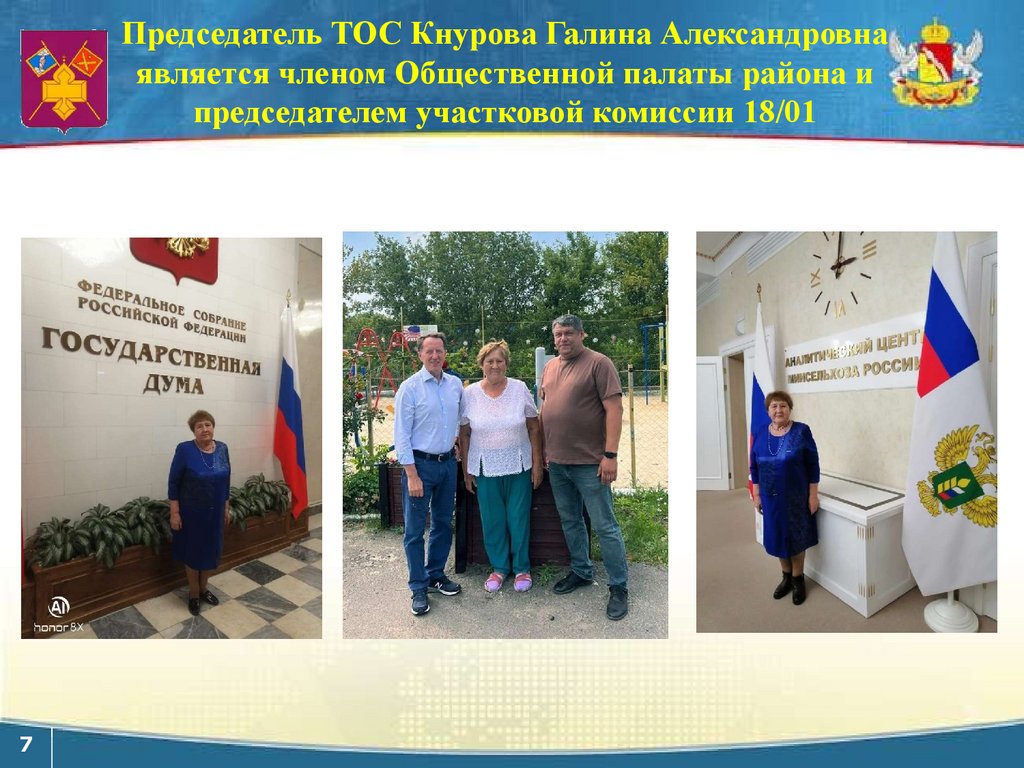 Председатель ТОС Кнурова Галина Александровнаявляется членом Общественной палаты района и