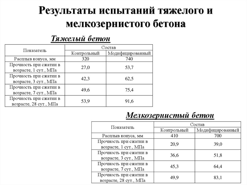 Результаты испытаний тяжелого имелкозернистого бетона