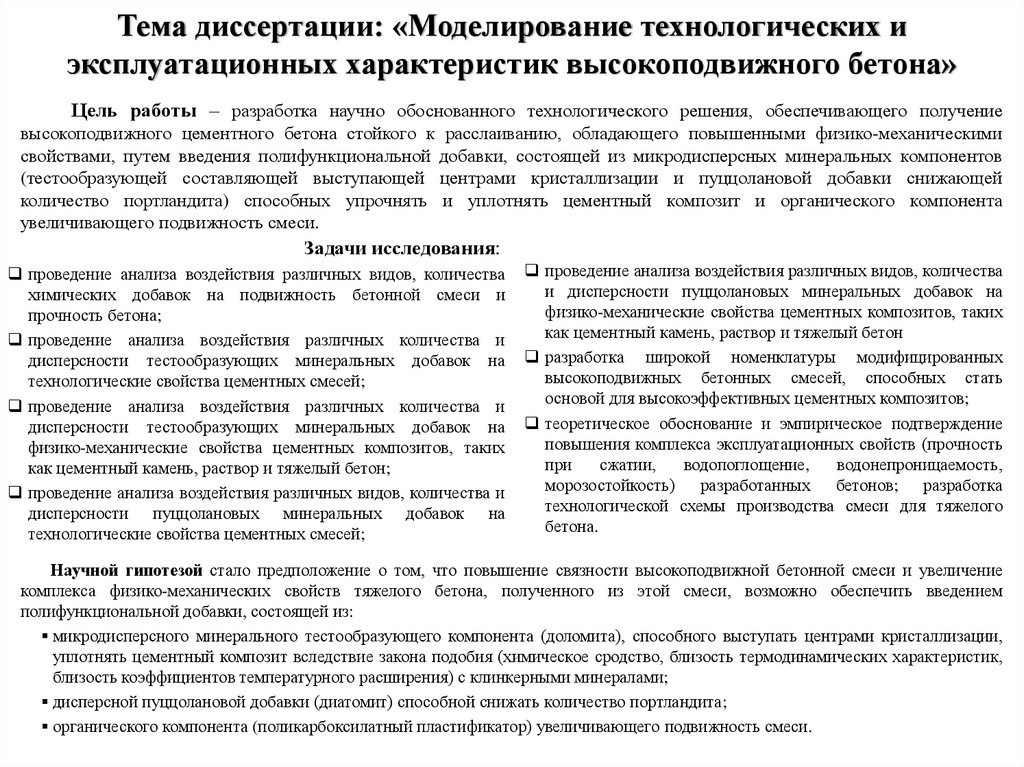 Тема диссертации: «Моделирование технологических иэксплуатационных характеристик высокоподвижного бетона»
