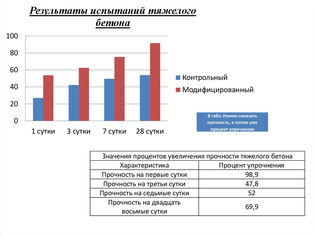 Значения процентов увеличения прочности тяжелого бетона