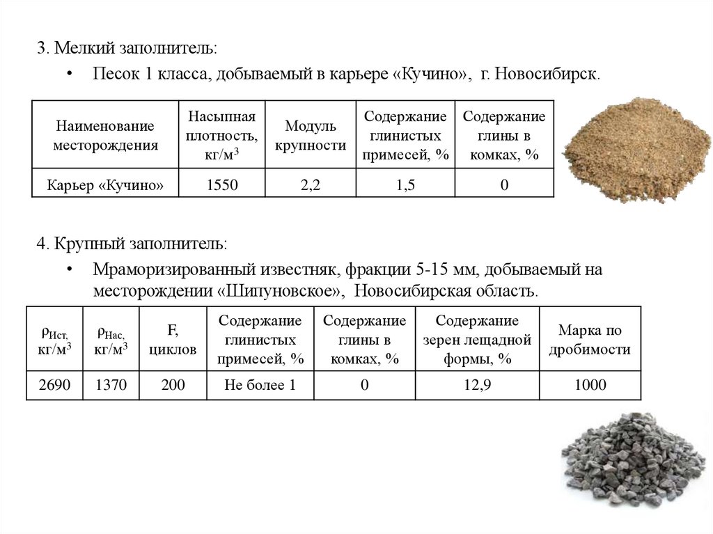 3. Мелкий заполнитель:• Песок 1 класса, добываемый в карьере «Кучино», г. Новосибирск.
