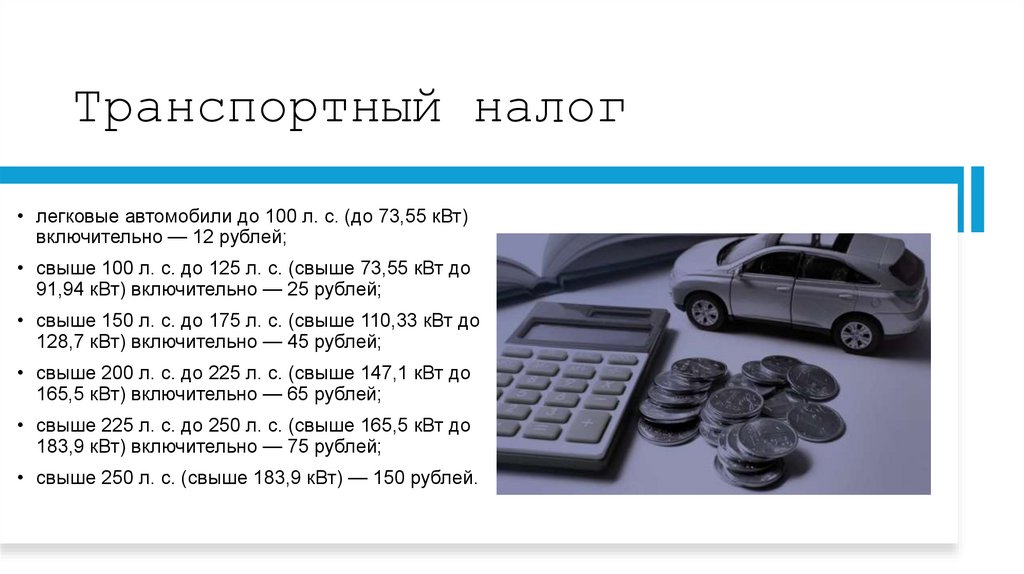 Транспортный налог• легковые автомобили до 100 л. с. (до 73,55 кВт)