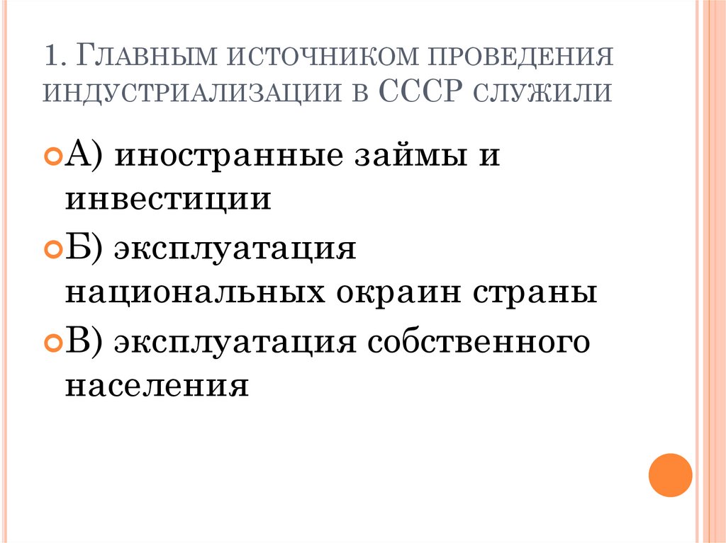 1. ГЛАВНЫМ ИСТОЧНИКОМ ПРОВЕДЕНИЯИНДУСТРИАЛИЗАЦИИ В СССР СЛУЖИЛИ