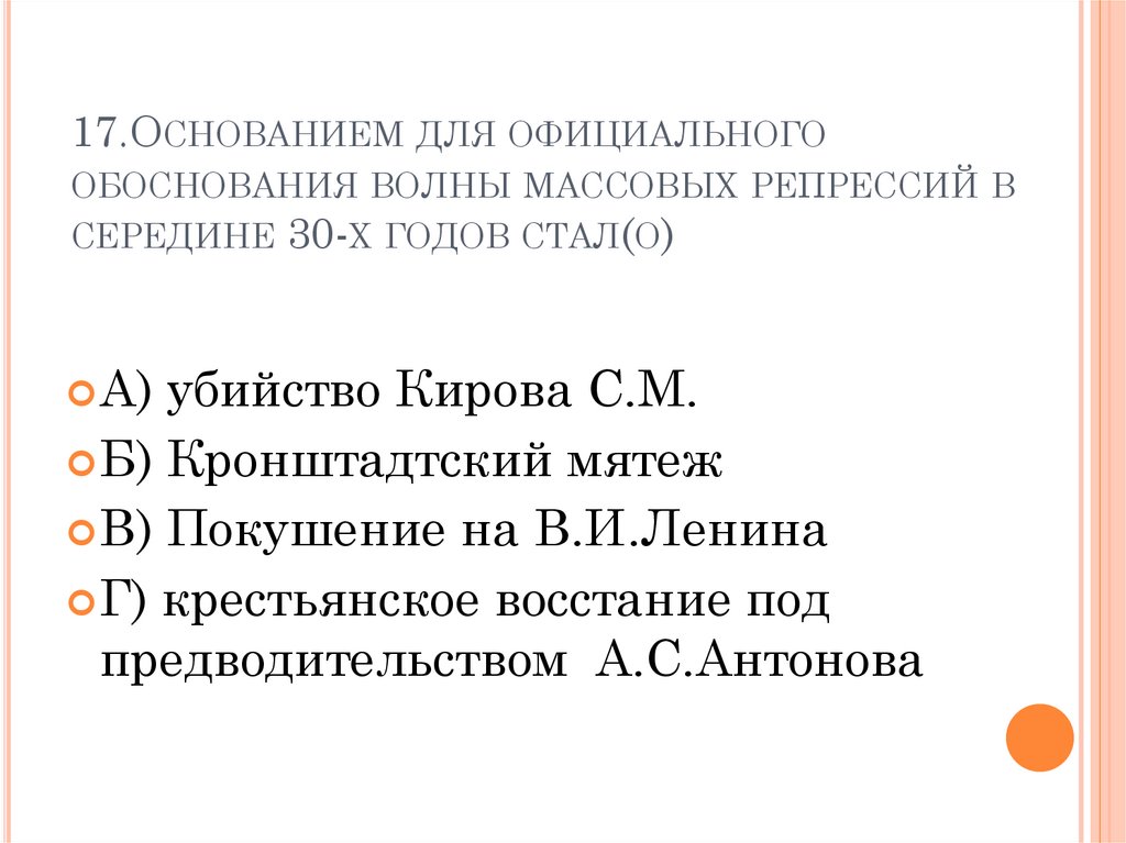 17.ОСНОВАНИЕМ ДЛЯ ОФИЦИАЛЬНОГООБОСНОВАНИЯ ВОЛНЫ МАССОВЫХ РЕПРЕССИЙ В