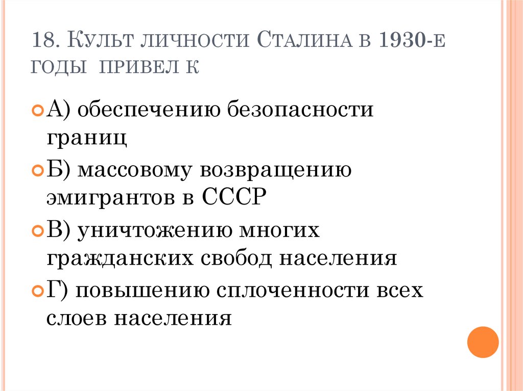 18. КУЛЬТ ЛИЧНОСТИ СТАЛИНА В 1930-ЕГОДЫ ПРИВЕЛ К