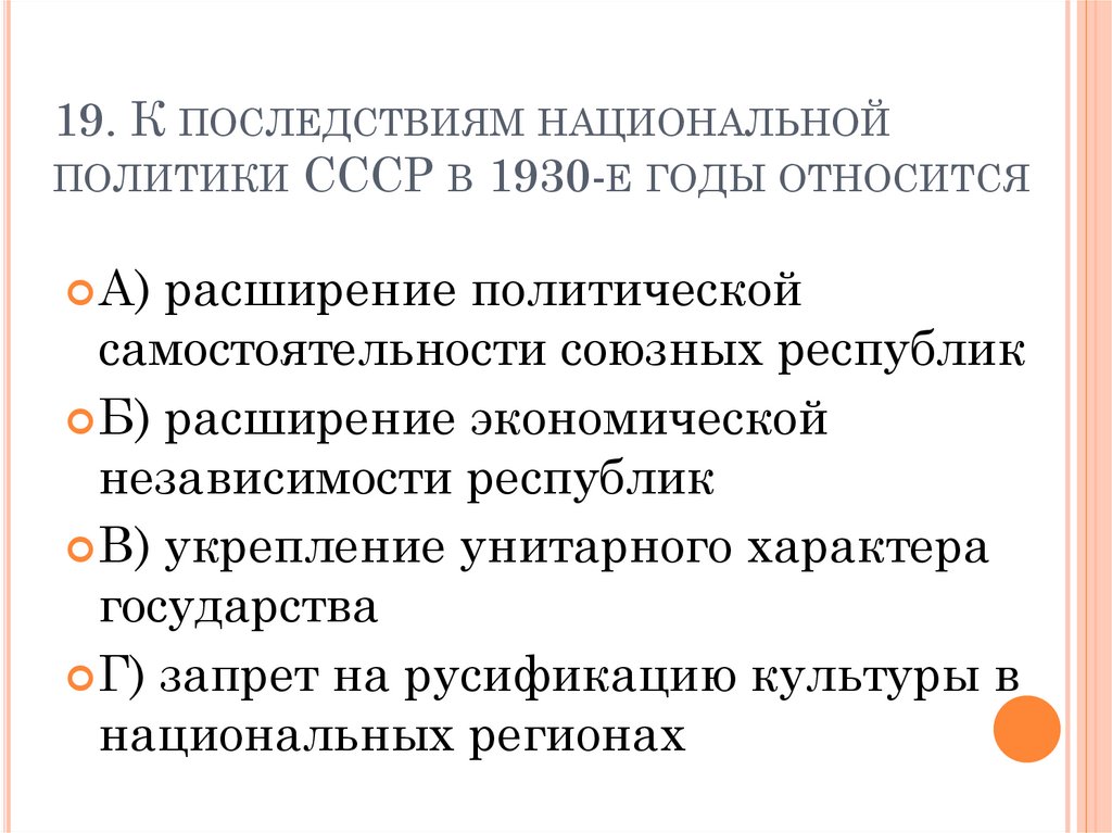 19. К ПОСЛЕДСТВИЯМ НАЦИОНАЛЬНОЙПОЛИТИКИ СССР В 1930-Е ГОДЫ ОТНОСИТСЯ