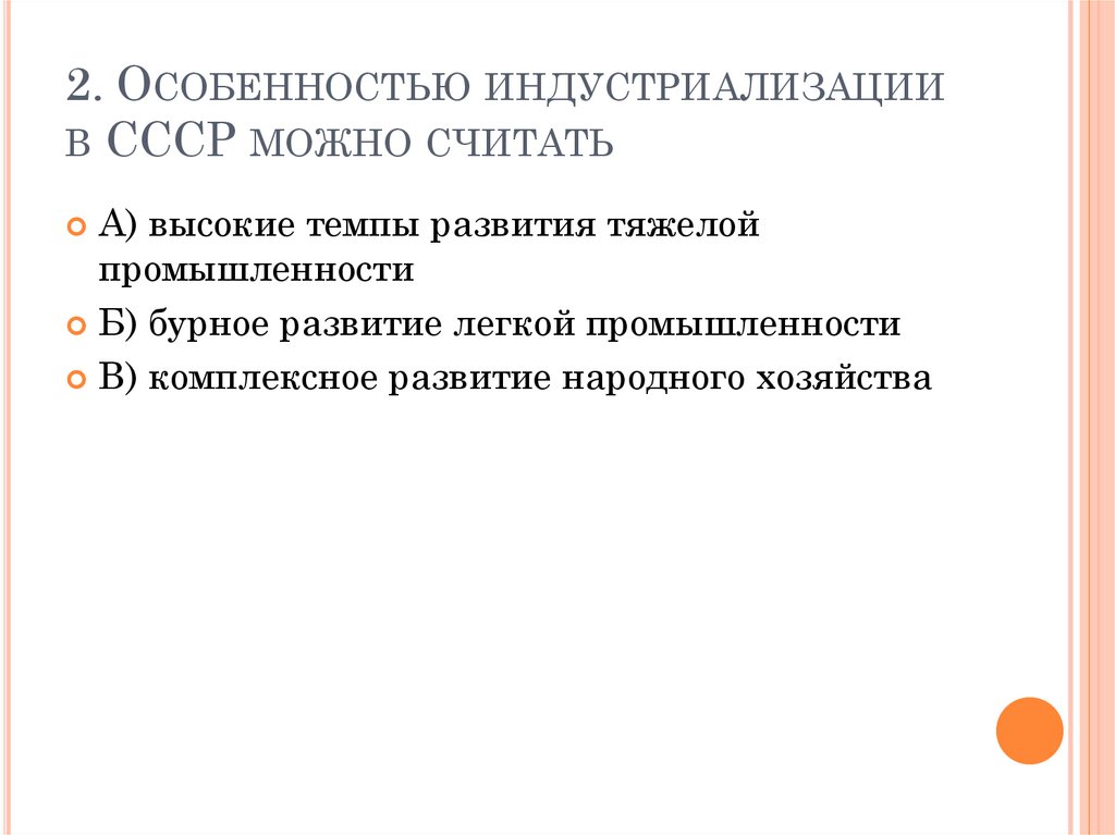 2. ОСОБЕННОСТЬЮ ИНДУСТРИАЛИЗАЦИИВ СССР МОЖНО СЧИТАТЬ