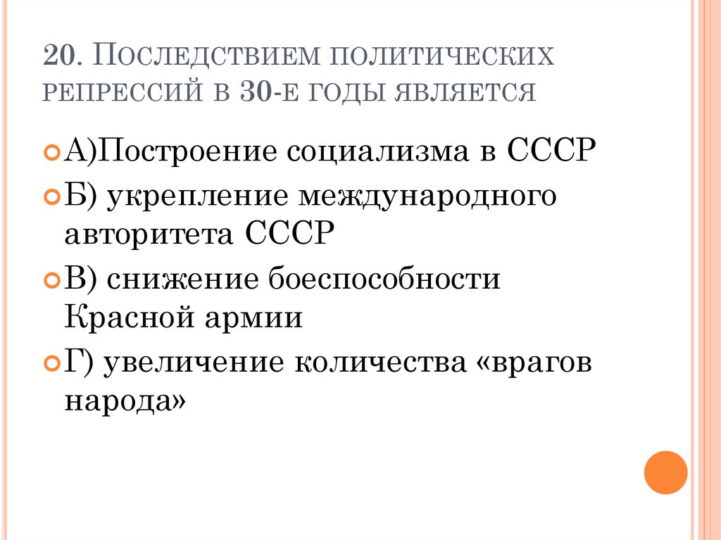 20. ПОСЛЕДСТВИЕМ ПОЛИТИЧЕСКИХРЕПРЕССИЙ В 30-Е ГОДЫ ЯВЛЯЕТСЯ