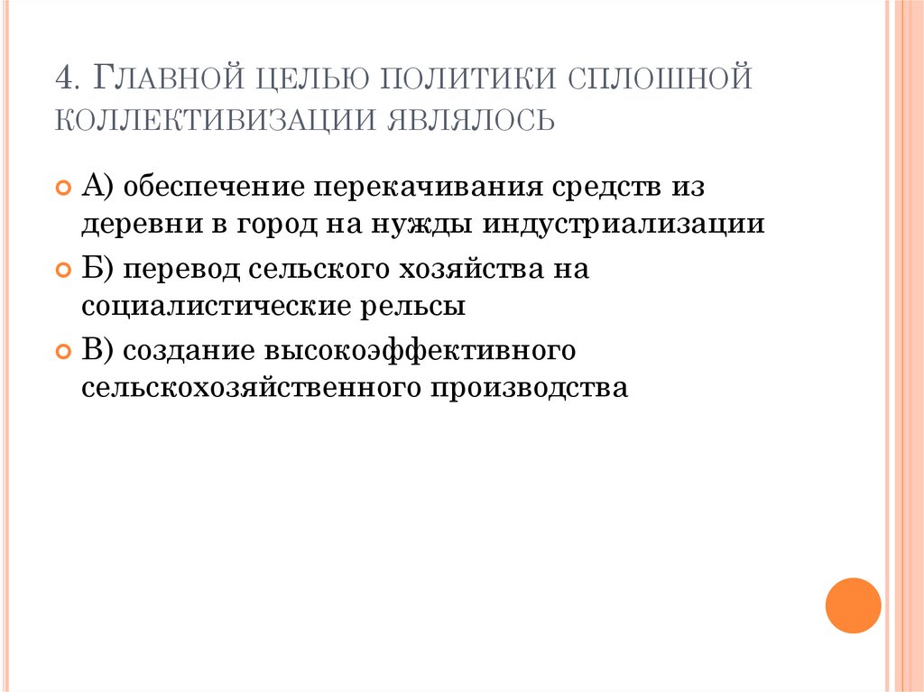 4. ГЛАВНОЙ ЦЕЛЬЮ ПОЛИТИКИ СПЛОШНОЙКОЛЛЕКТИВИЗАЦИИ ЯВЛЯЛОСЬ