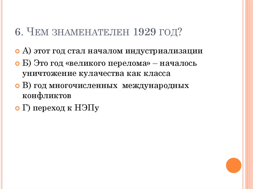6. ЧЕМ ЗНАМЕНАТЕЛЕН 1929 ГОД?А) этот год стал началом индустриализации