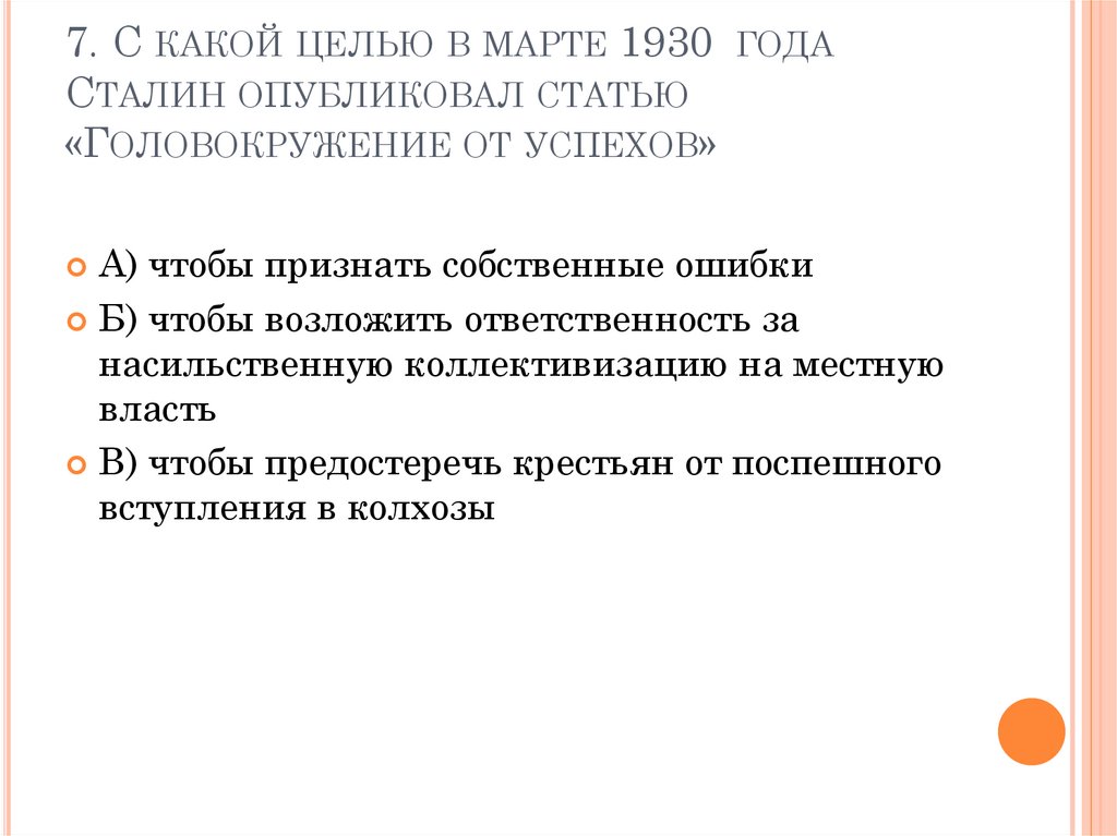 7. С КАКОЙ ЦЕЛЬЮ В МАРТЕ 1930 ГОДАСТАЛИН ОПУБЛИКОВАЛ СТАТЬЮ