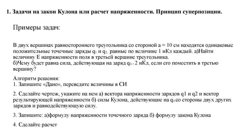 1. Задачи на закон Кулона или расчет напряженности. Принцип суперпозиции.Примеры задач: