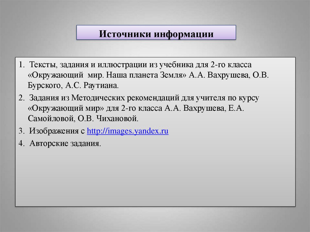 Источники информации1. Тексты, задания и иллюстрации из учебника для 2-го класса