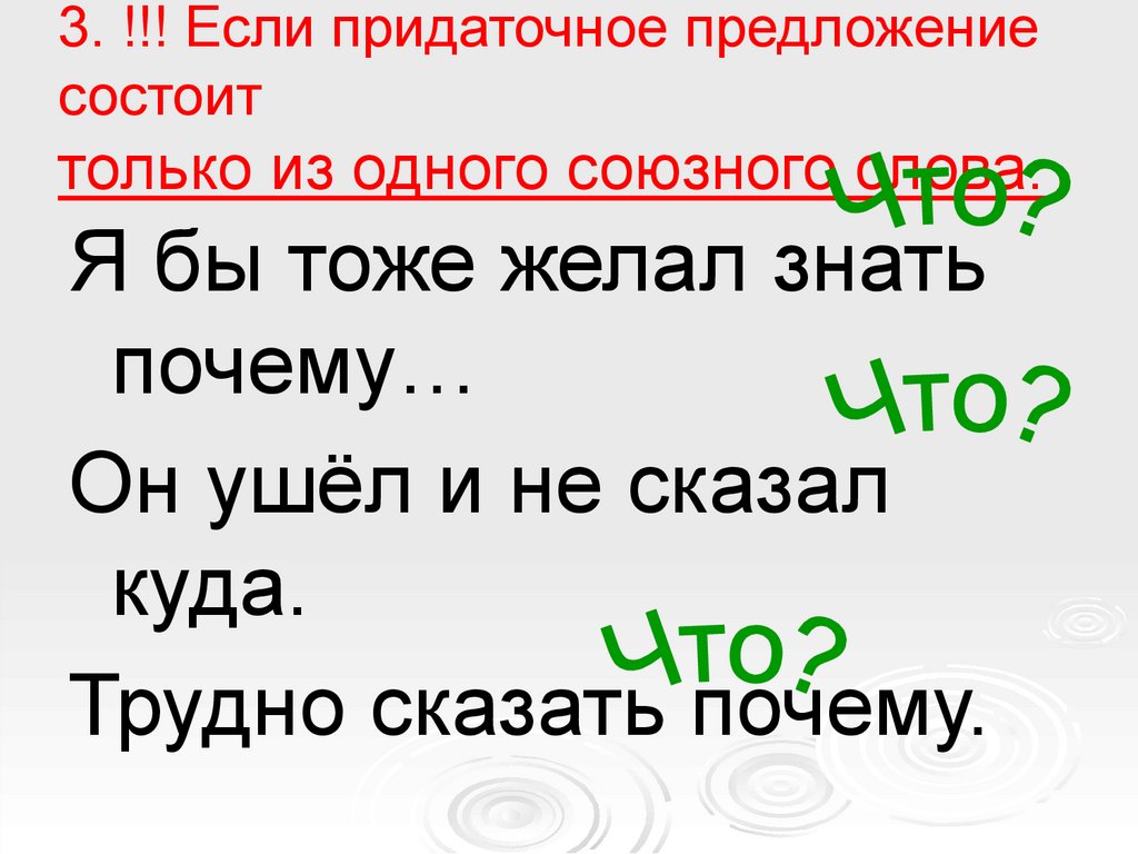 придаточное предложение состоит только из одного союзного слова.