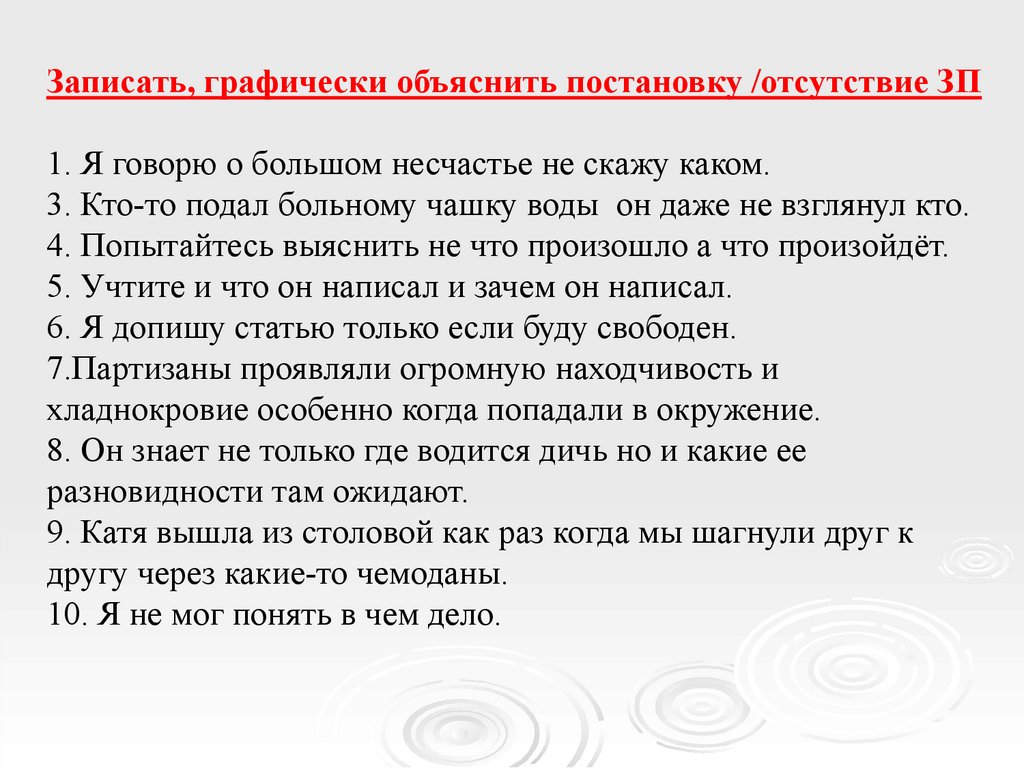 Записать, графически объяснить постановку /отсутствие ЗП1. Я говорю о большом несчастье не скажу каком.