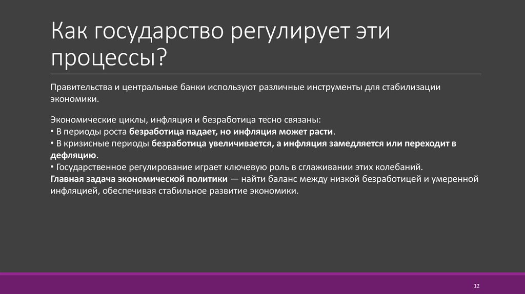 • Государственное регулирование играет ключевую роль в сглаживании этих колебаний.