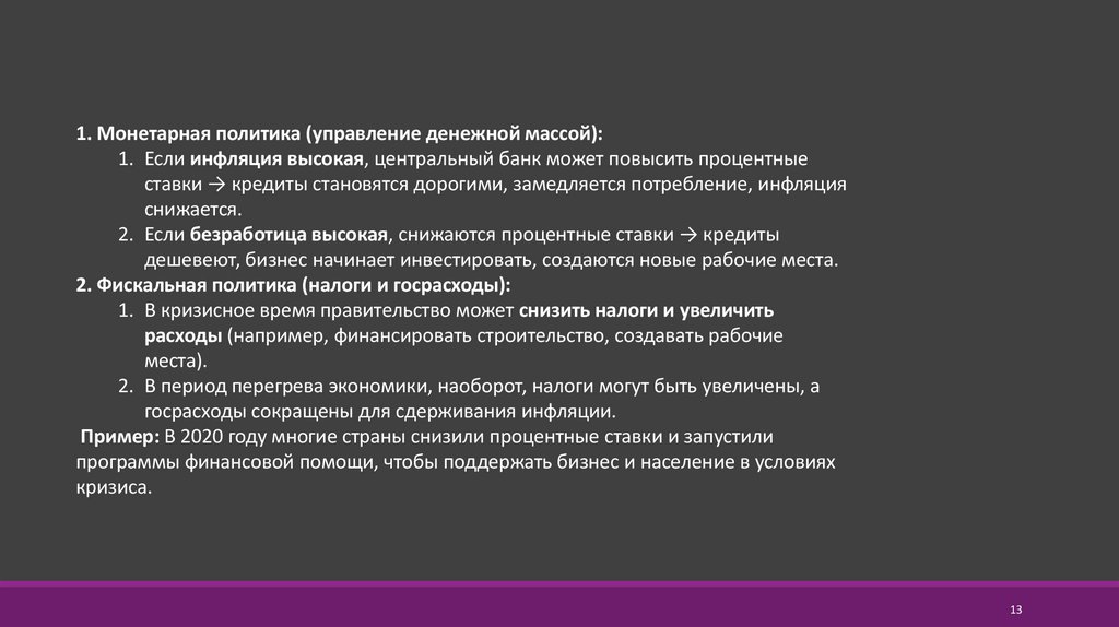1. Монетарная политика (управление денежной массой):1. Если инфляция высокая, центральный банк может повысить процентные