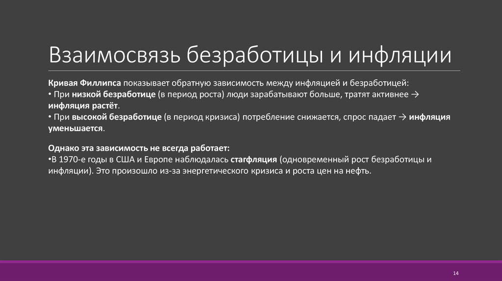 • В кризисные периоды безработица увеличивается, а инфляция замедляется или переходит в