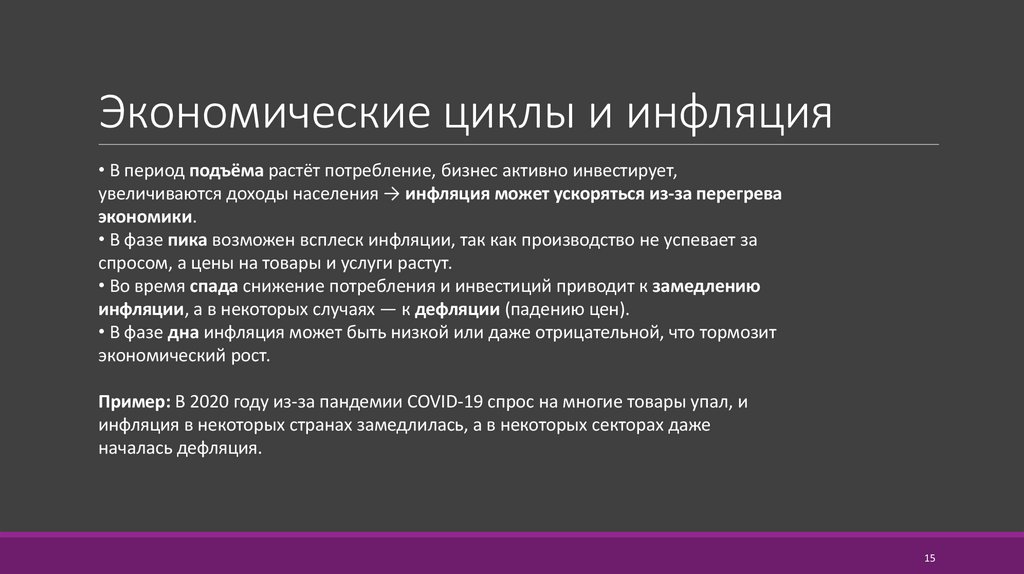 Экономические циклы и инфляция• В период подъёма растёт потребление, бизнес активно инвестирует,