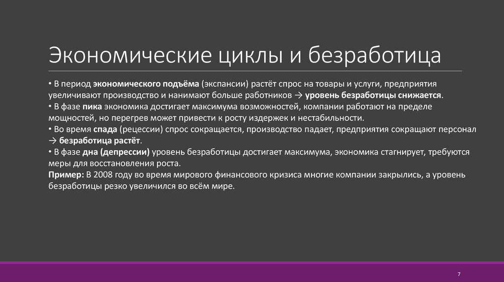 Экономические циклы и безработица• В период экономического подъёма (экспансии) растёт спрос на товары и услуги, предприятия